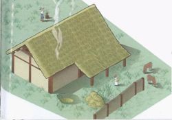 Proposition de restitution d'un bâtiment en torchis (12*8 mètres) fondé sur poteaux des le VII-VIII ème siècles.