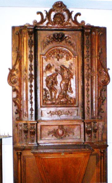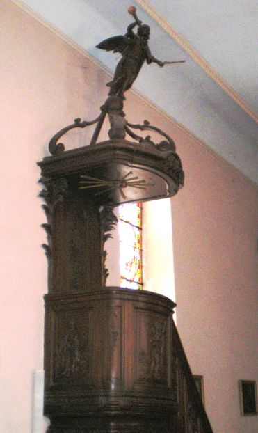 Cette chaire en bois est surmontée d'un abat-voix, sorte de petit dias disposé à cet emplacement pour rabattre, par réflexion, la voix de l'orateur vers l'auditoire. La cuve est ornée de cinq panneaux sculptés représentant le Christ et les apôtres. (CL. M.H.)