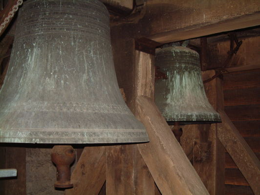 Les 3 cloches qui font actuellement le beau carillon de l'église présent, ont un poids respectif de 630 - 347 et 203 kg pour un diamètre de 1,04 m - 0,83m et 0.60m.